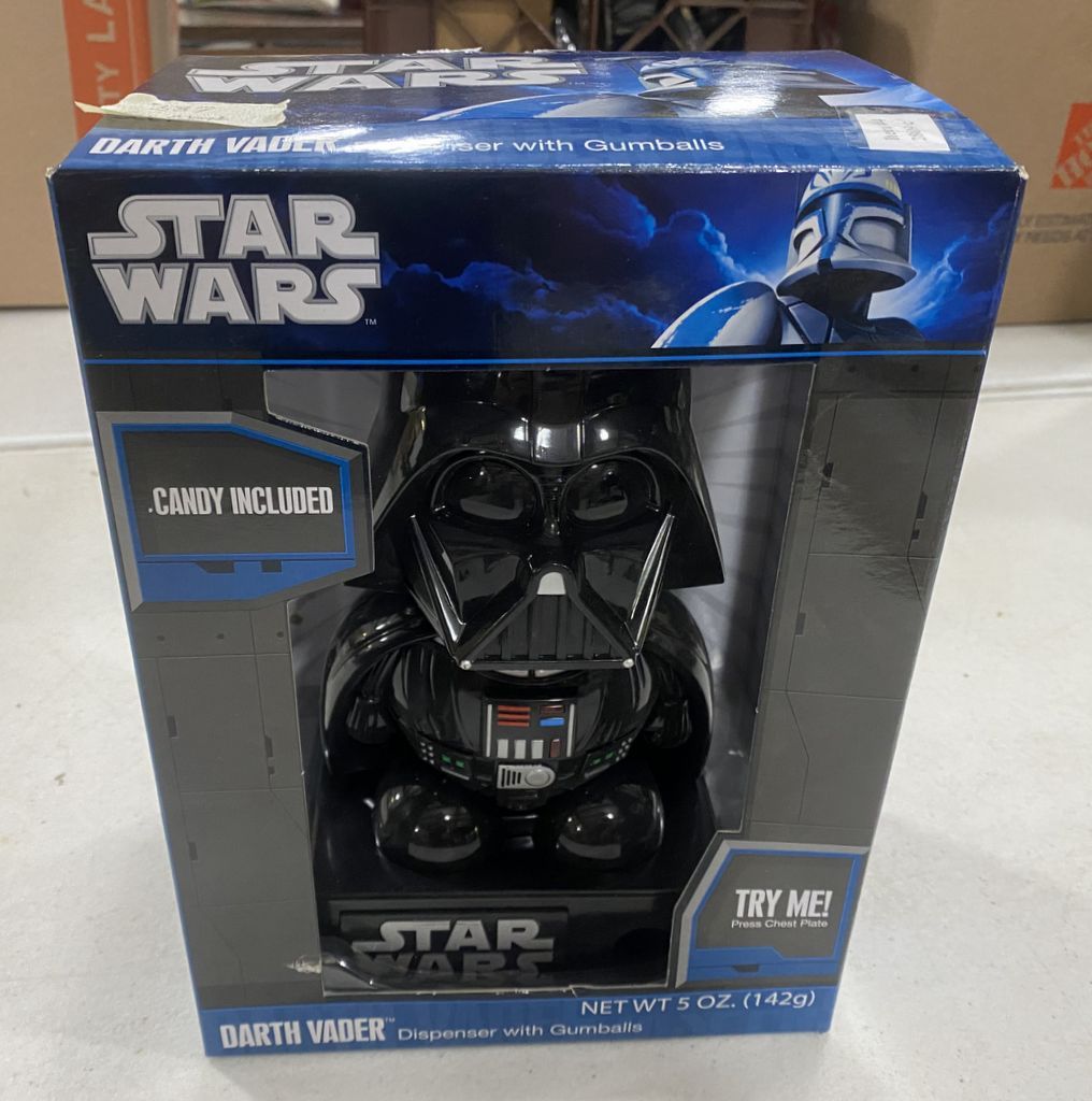 Star Wars Darth Vader Gumball Dispenser, battery included, light and sound works, new in box, never removed, but gum has been removed. Location Right Metal Shelves Star Wars Darth Vader Gumball Dispenser, battery included, light and sound works, new in box, never removed, but gum has been removed. Location Right Metal Shelves