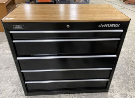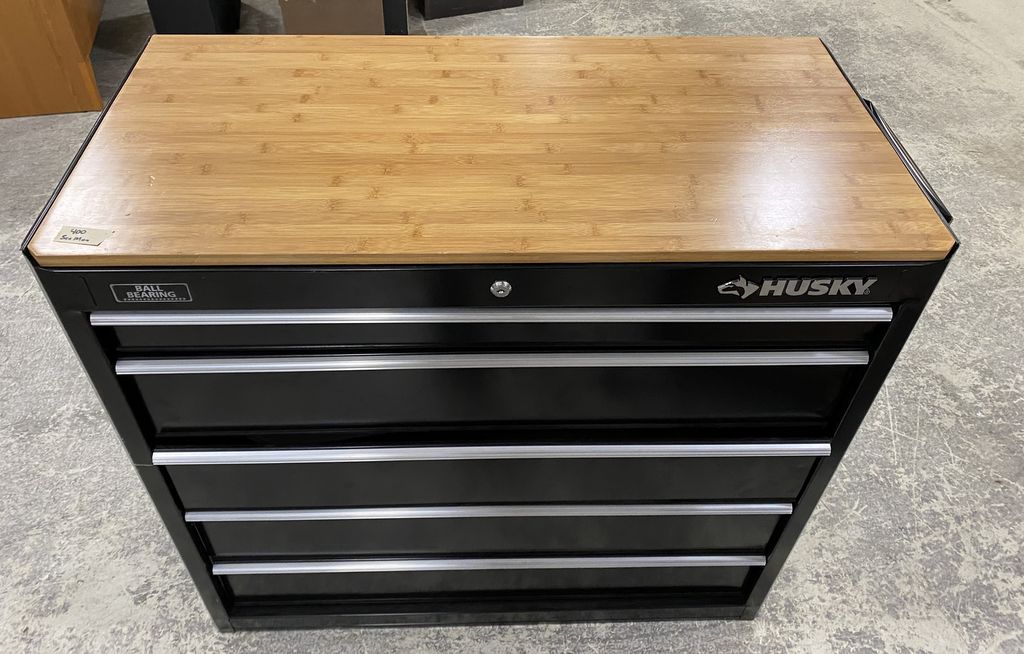 Husky Tool Box, has no wheels, 33"h., 37"w., 18"d. Location: 3rd Row Husky Tool Box, has no wheels, 33"h., 37"w., 18"d. Location: 3rd Row