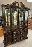Late 20th Century Traditional Cherry China Cabinet, two piece, 6 drawers, two doors, mirrored back with glass shelves, 88"h., 63"w., 16"d. Location: 3rd Row Late 20th Century Traditional Cherry China Cabinet, two piece, 6 drawers, two doors, mirrored back with glass shelves, 88"h., 63"w., 16"d. Location: 3rd Row