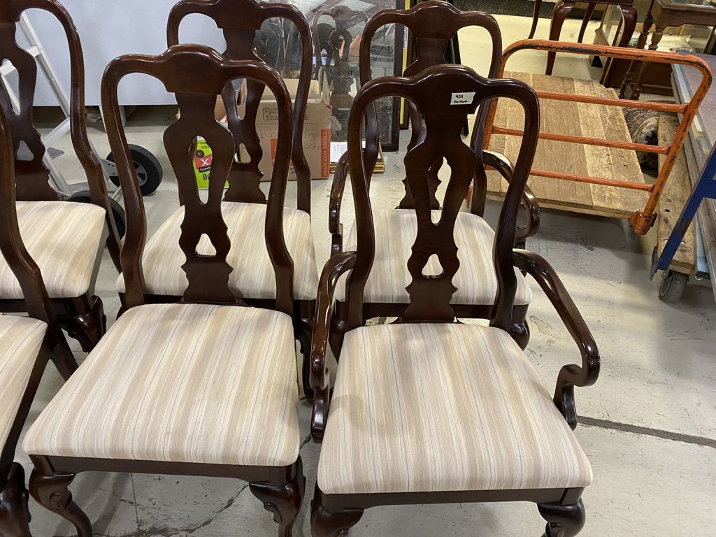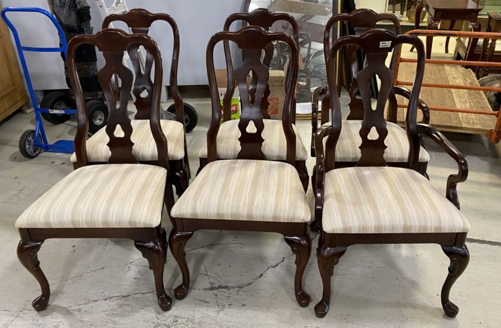 6 Cherry Queen Anne Dining Chairs, two arms, four side chairs, fabric cushions, upholstery, dark cherry finish. Location: 3rd Row 6 Cherry Queen Anne Dining Chairs, two arms, four side chairs, fabric cushions, upholstery, dark cherry finish. Location: 3rd Row