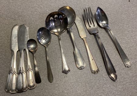 Group of Assorted Sterling Flatware Pieces, 5 butter knives, cream spoon, soup spoon, fork, spoons. 8.60 ozt. Group of Assorted Sterling Flatware Pieces, 5 butter knives, cream spoon, soup spoon, fork, spoons. 8.60 ozt.