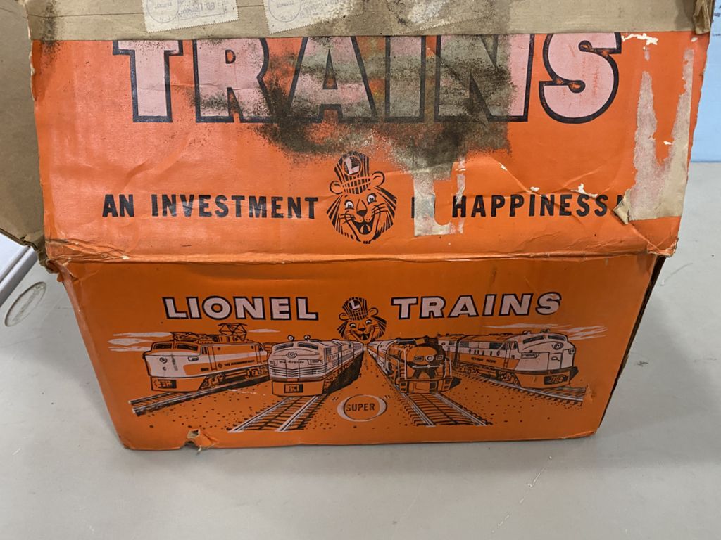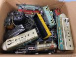 Box of Vintage Train Set, has train cars and tracks. Location Left Metal Shelves Box of Vintage Train Set, has train cars and tracks. Location Left Metal Shelves