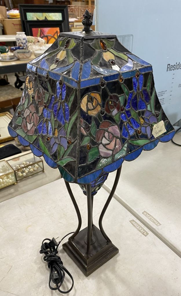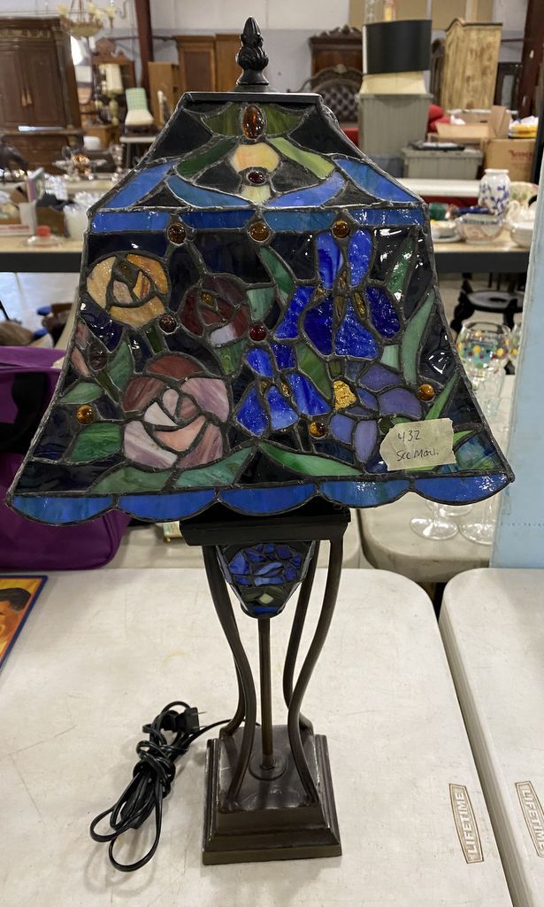 Heavy Tiffany Style Lamp, with night light, blue/multi 24"h., 10"w. good condition. Location: 2nd Row Heavy Tiffany Style Lamp, with night light, blue/multi 24"h., 10"w. good condition. Location: 2nd Row