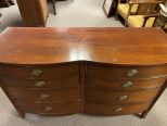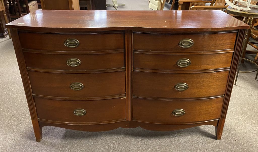 Duncan Phyfe Mahogany Double Dresser, has several veneer damage spots, 34"h., 54"w., 19"d. Location: 5th Row Duncan Phyfe Mahogany Double Dresser, has several veneer damage spots, 34"h., 54"w., 19"d. Location: 5th Row