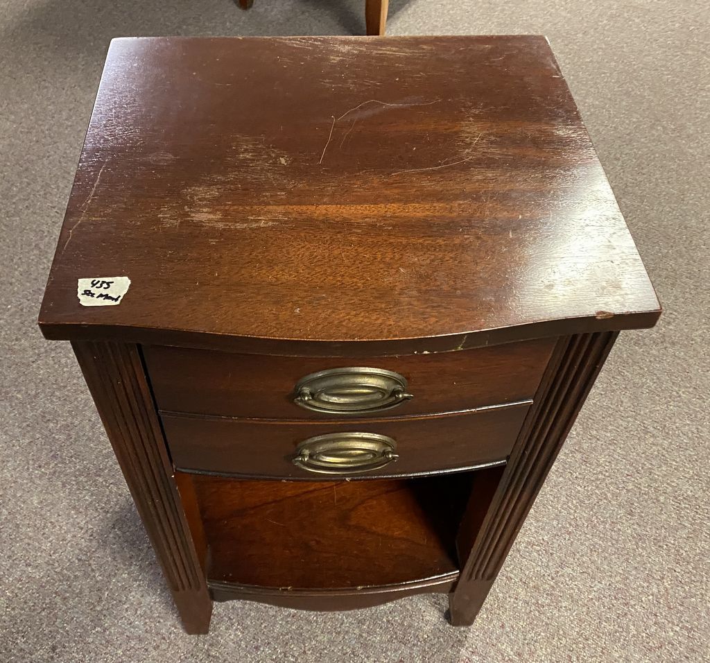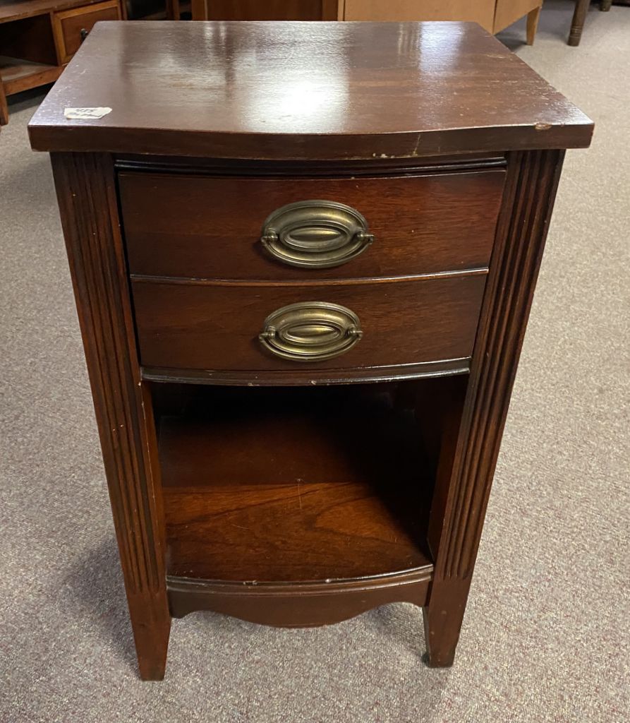 Duncan Phyfe Mahogany Night Stand, single drawer, open front, has finish wear, 27"h., 16"w. Location: 5th Row Duncan Phyfe Mahogany Night Stand, single drawer, open front, has finish wear, 27"h., 16"w. Location: 5th Row