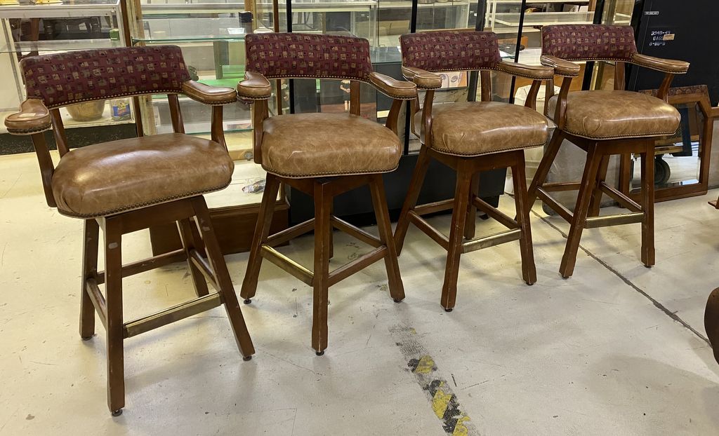 Four Modern Heavy Bar Stools, leather cushions, needs work, 30" seat to ground, Location Left Office Four Modern Heavy Bar Stools, leather cushions, needs work, 30" seat to ground, Location Left Office