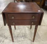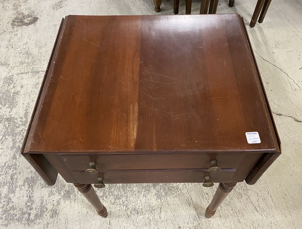 Willett Mahogany Drop Leaf Side Table, two drawers, 27"h., 20"w. has some wear. Location: 6th Row Willett Mahogany Drop Leaf Side Table, two drawers, 27"h., 20"w. has some wear. Location: 6th Row