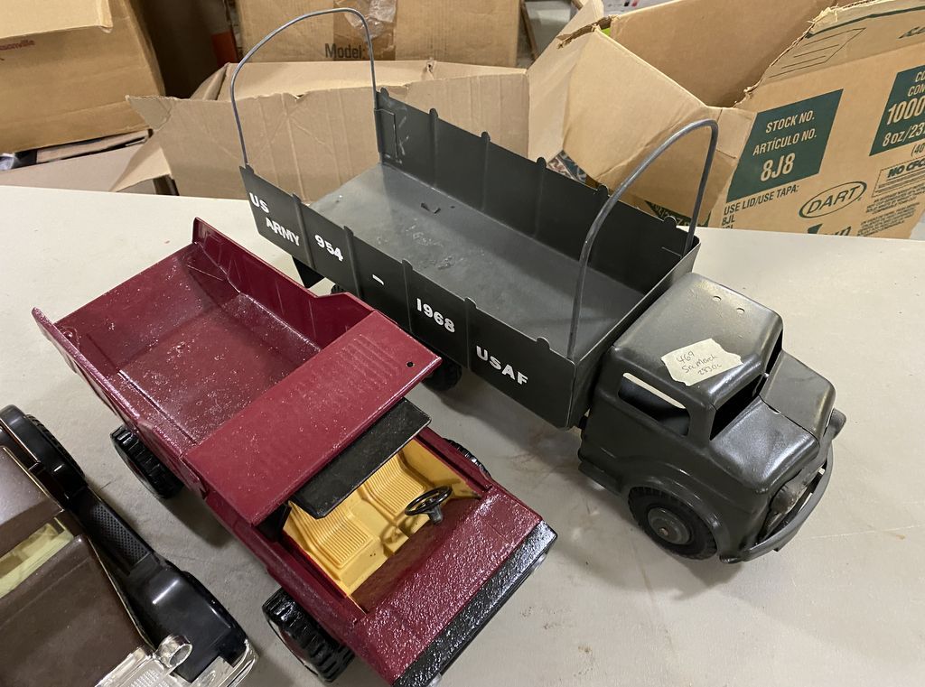 Three Metal Trucks, Nylint Auto Repair, Dump Truck, US Army Truck, 18", Location Right Metal Shelves Three Metal Trucks, Nylint Auto Repair, Dump Truck, US Army Truck, 18", Location Right Metal Shelves