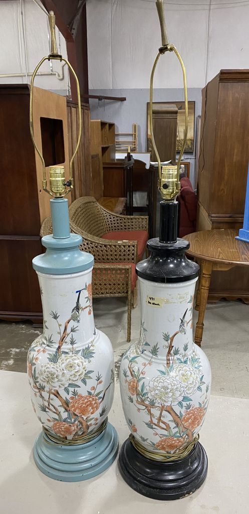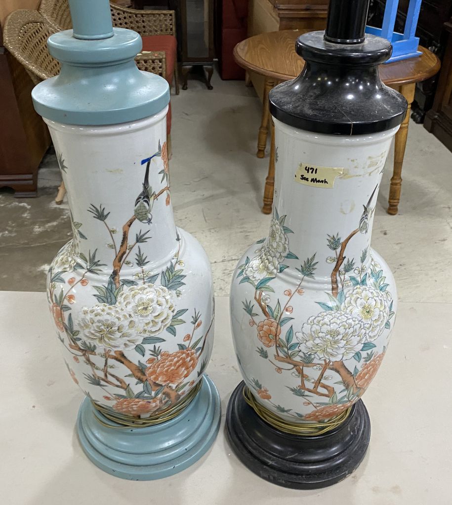 Pair of Asian Porcelain Vase Lamps, flower design, wood base, no shades, 40"h. Location: 5th Row Pair of Asian Porcelain Vase Lamps, flower design, wood base, no shades, 40"h. Location: 5th Row
