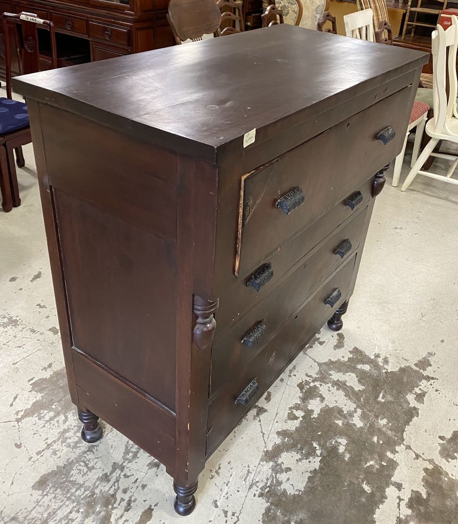 Antique Empire Mahogany Chest of Drawers, four drawers, has wear and scratches, 46"h., 43"w., 26"d. Location: 2nd Row Antique Empire Mahogany Chest of Drawers, four drawers, has wear and scratches, 46"h., 43"w., 26"d. Location: 2nd Row