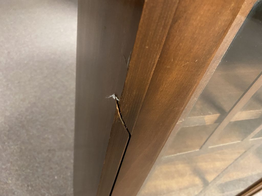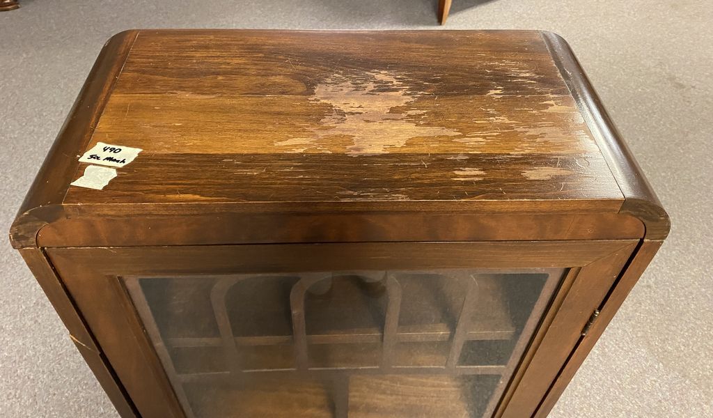 Small Depression Era China Cabinet/ Bookcase, single glass door, three shelves, has wear on finish, crack on side frame, 44"h., 23"w., 10"d. Location: 5th Row Small Depression Era China Cabinet/ Bookcase, single glass door, three shelves, has wear on finish, crack on side frame, 44"h., 23"w., 10"d. Location: 5th Row