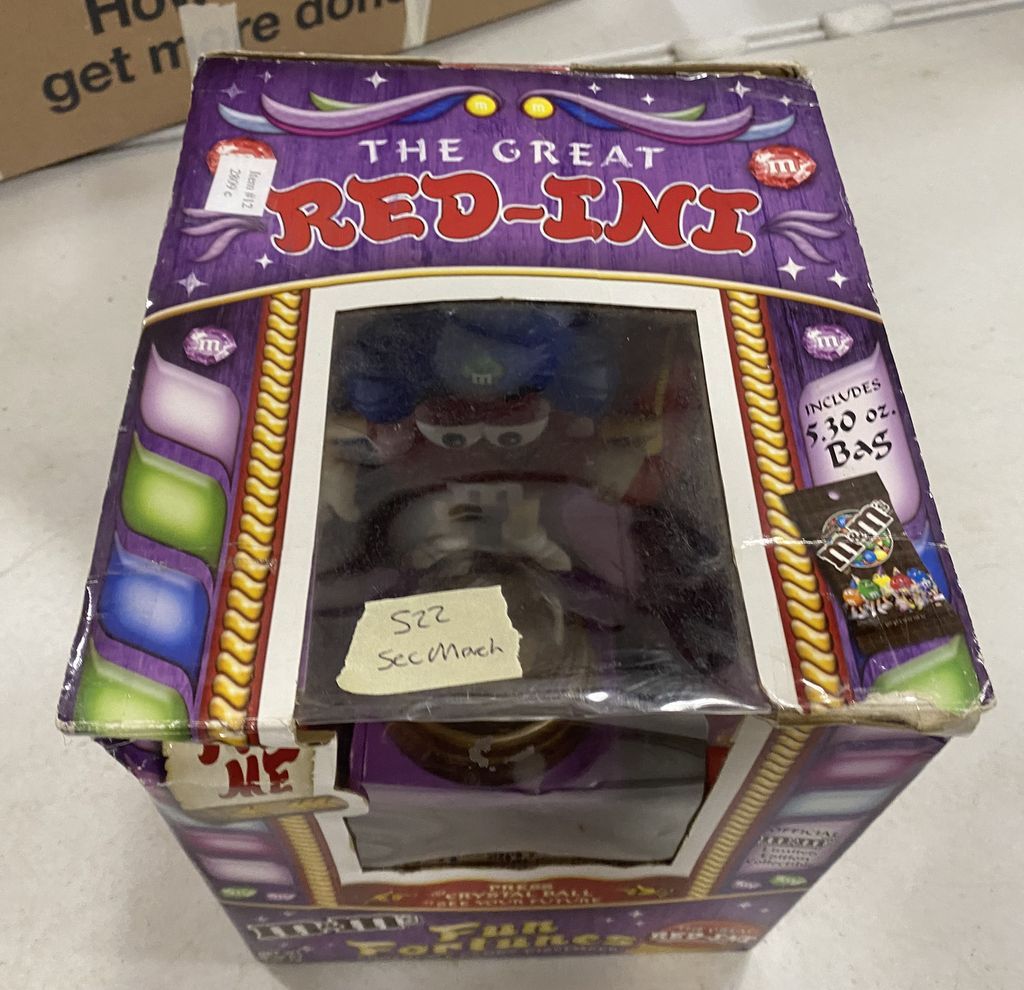 M & M's Great Red-INI Fun Fortunes Candy Dispenser, limited edition, in original box, used. Location Right Metal Shelves M & M's Great Red-INI Fun Fortunes Candy Dispenser, limited edition, in original box, used. Location Right Metal Shelves