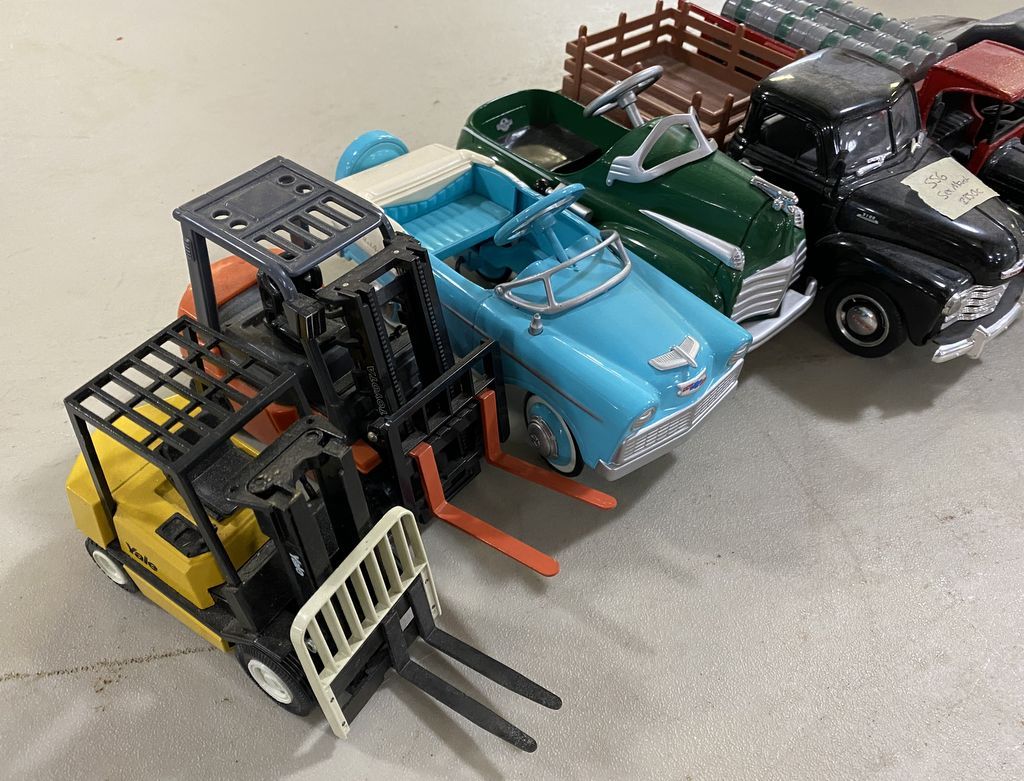 Two forklifts, two mini peddle cars, classic trucks. Location Right Metal Shelves Two forklifts, two mini peddle cars, classic trucks. Location Right Metal Shelves