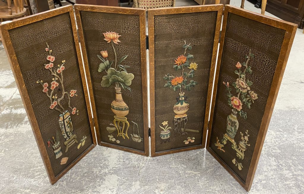 Four Panel Asian Style Wall Screen, with floral stone designs, 36"h., 14"w. Location: 6th Row Four Panel Asian Style Wall Screen, with floral stone designs, 36"h., 14"w. Location: 6th Row