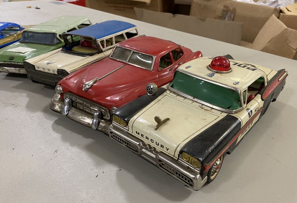 Five Vintage Metal Toy Cars, Fords and Mercury, aged condition. Location Right Metal Shelves Five Vintage Metal Toy Cars, Fords and Mercury, aged condition. Location Right Metal Shelves