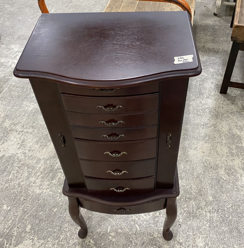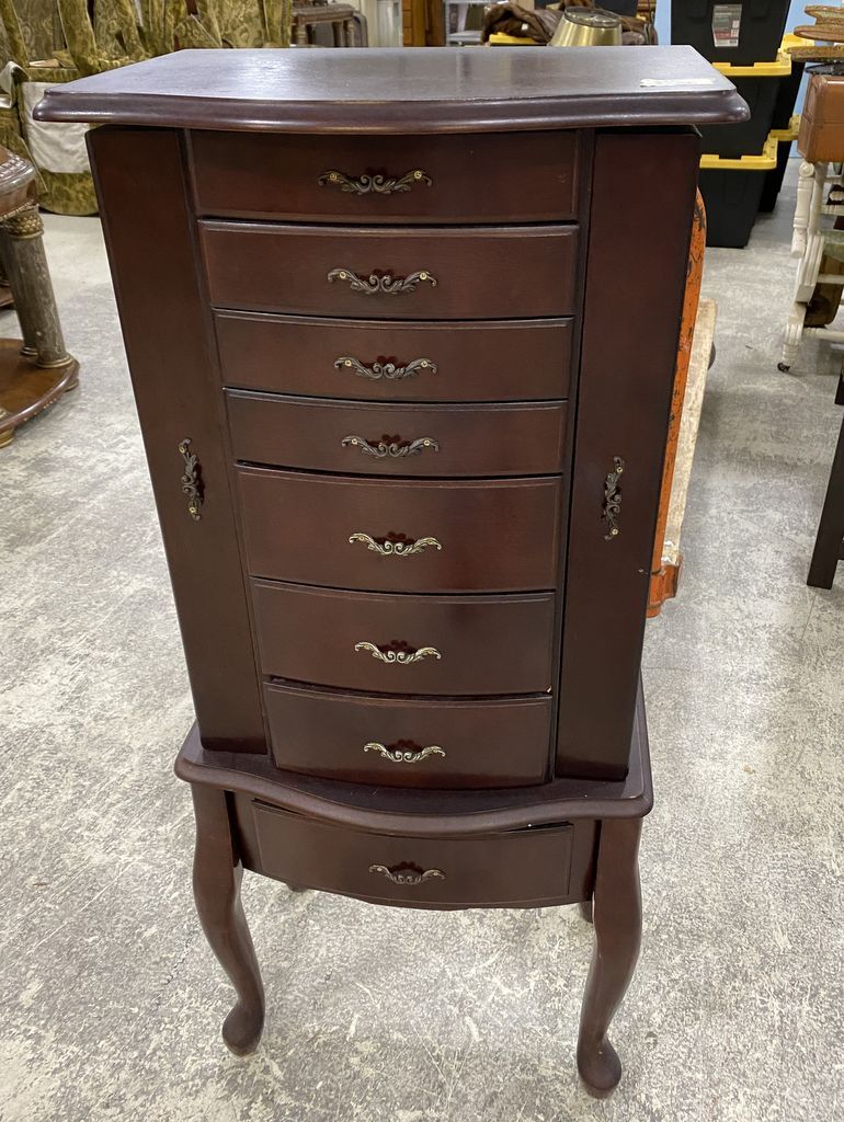 Thomas Pacconi Classics Jewelry Armoire, cherry, light wear, 39"h., 16"w. Location: 4th Row Thomas Pacconi Classics Jewelry Armoire, cherry, light wear, 39"h., 16"w. Location: 4th Row