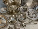 Group of Silver Plate Serving Pieces, clean, trays, boxes, compotes, plates, mug, butter dish, spoons. Location Left Metal Shelves Group of Silver Plate Serving Pieces, clean, trays, boxes, compotes, plates, mug, butter dish, spoons. Location Left Metal Shelves