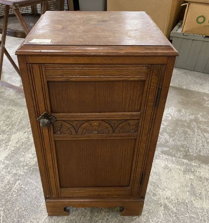 Vintage Oak Commode, single door, ring mark on top, 27"h., 15"w. Location: 3rd Row Vintage Oak Commode, single door, ring mark on top, 27"h., 15"w. Location: 3rd Row