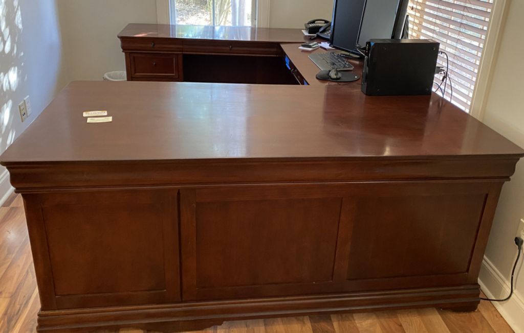 Modern Three Sectional Office Desk, pressed wood, middle section was damage by connection, cherry finish. Modern Three Sectional Office Desk, pressed wood, middle section was damage by connection, cherry finish.