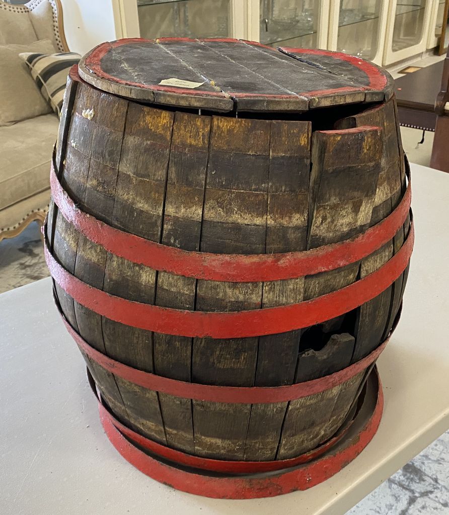 Old Wood Barrel, damaged, needs work, metal banded, 20"h. ,16"dia. Location: 2nd Row Old Wood Barrel, damaged, needs work, metal banded, 20"h. ,16"dia. Location: 2nd Row