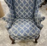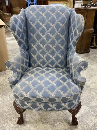 Chippendale Style Wing Back Arm Chair, ball-n-claw footed, blue upholstered, good shape. Location: 1st Row Chippendale Style Wing Back Arm Chair, ball-n-claw footed, blue upholstered, good shape. Location: 1st Row