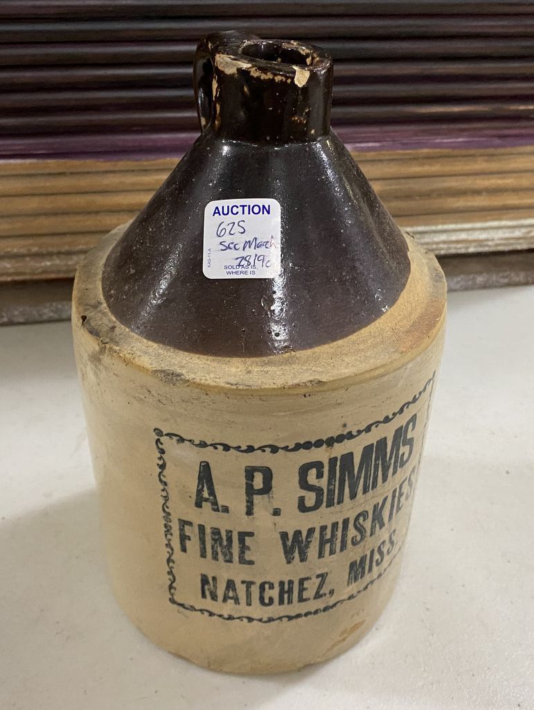 A.P. Simms Whiskey Jug Natchez MS, has chips, 10"h. Location Left Metal Shelves A.P. Simms Whiskey Jug Natchez MS, has chips, 10"h. Location Left Metal Shelves