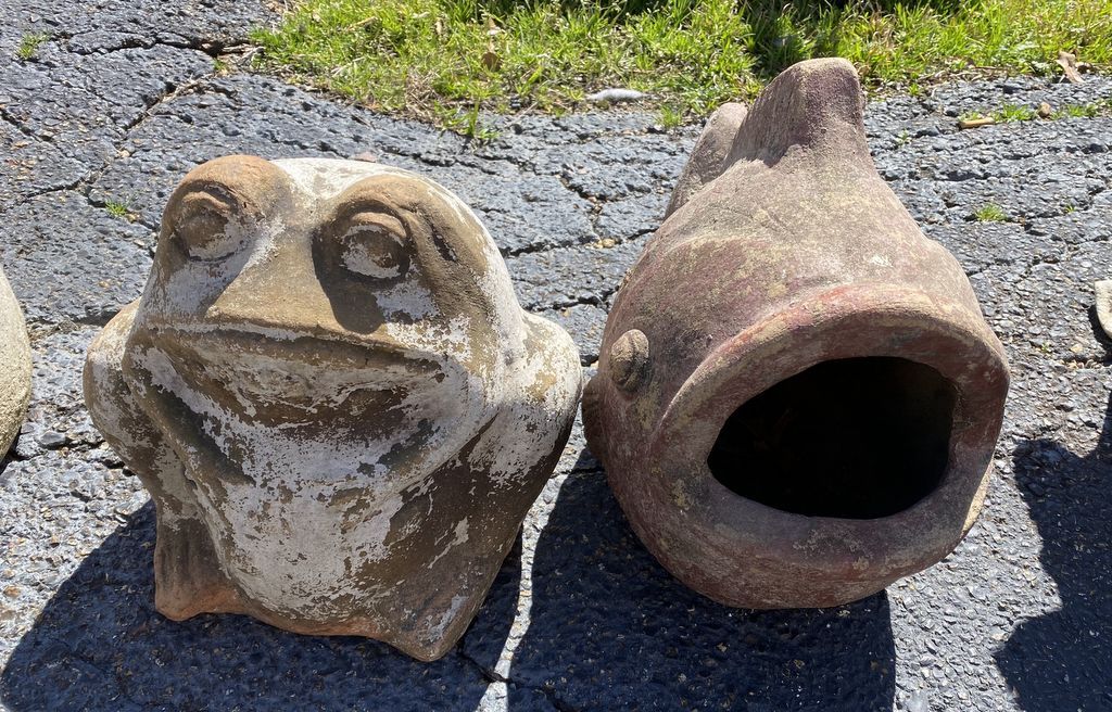 Concrete Fish and Frog Outdoor Art, weathered. Concrete Fish and Frog Outdoor Art, weathered.