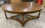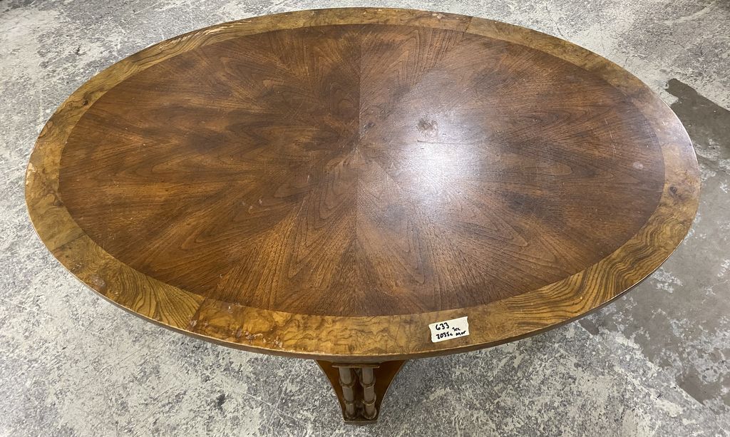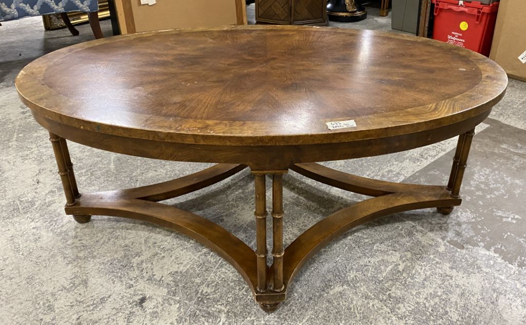 Baker Furniture Co. Oval Coffee Table, light wear, 17"h., 42"w. Location: 3rd Row Baker Furniture Co. Oval Coffee Table, light wear, 17"h., 42"w. Location: 3rd Row