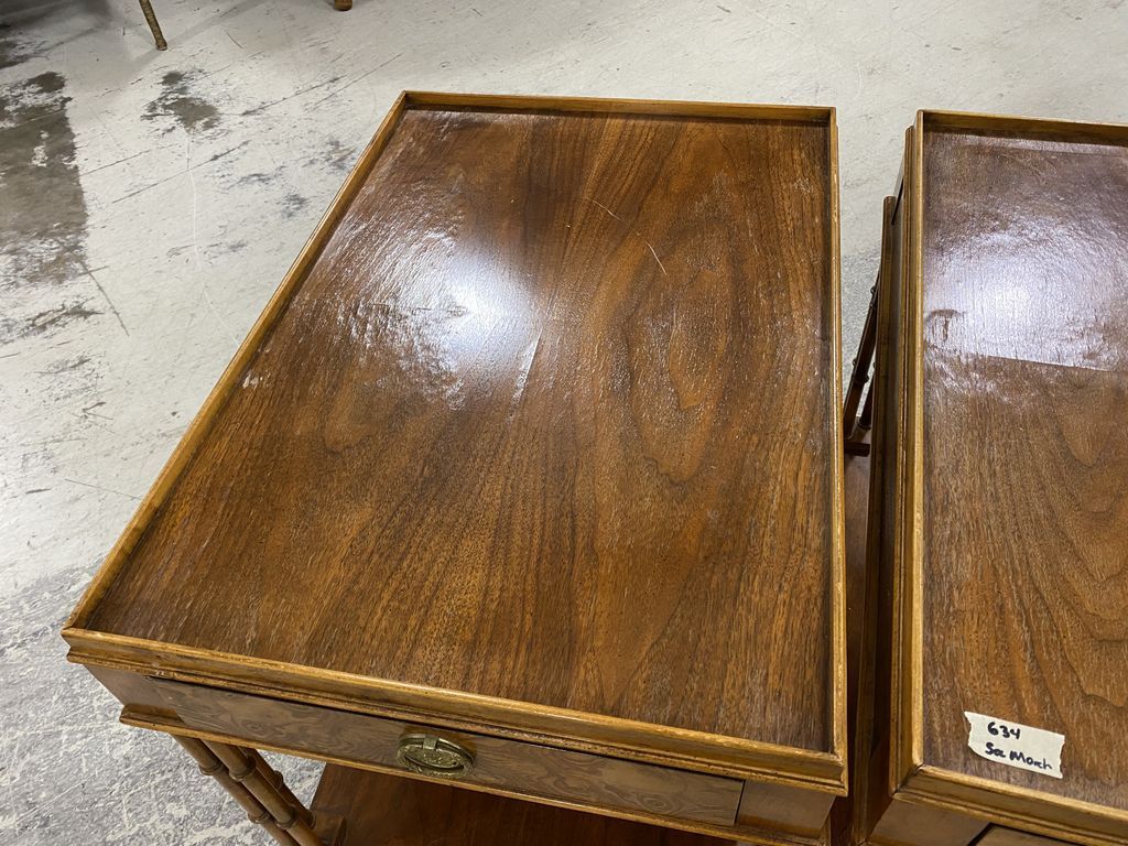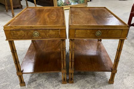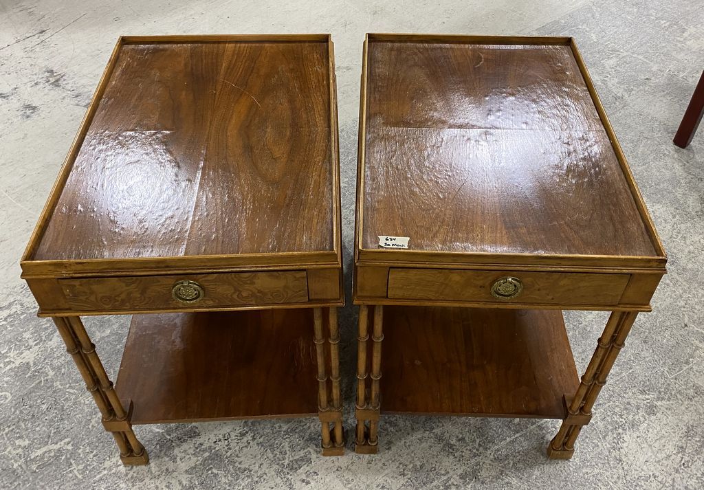 Pair of Baker Furniture Co. Lamp Tables, single drawers, two tier, wear on tops, 25"h., 18"w., 26"d. Location: 3rd Row Pair of Baker Furniture Co. Lamp Tables, single drawers, two tier, wear on tops, 25"h., 18"w., 26"d. Location: 3rd Row