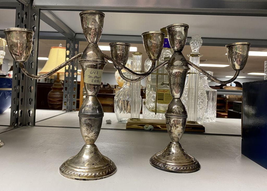 Couchin Weighted Sterling Candelabras, have tarnish, 10"h. Location Right Metal Shelves Couchin Weighted Sterling Candelabras, have tarnish, 10"h. Location Right Metal Shelves