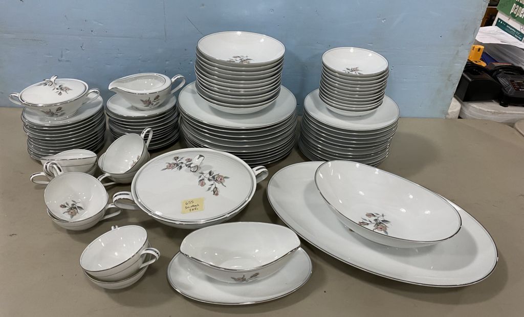 Noritake "Margot" China Set, 11 dinner, 12 bowls, 12 salads, platter, gravy, vegetable, cups, saucers, creamer, sugar, 12 berry bowls. Location Right Metal Shelves Noritake "Margot" China Set, 11 dinner, 12 bowls, 12 salads, platter, gravy, vegetable, cups, saucers, creamer, sugar, 12 berry bowls. Location Right Metal Shelves
