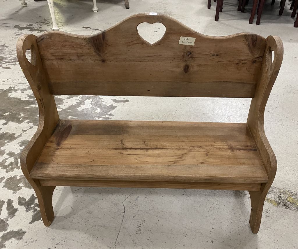 Vintage Child's Handcrafted Bench, heart back, 27"h., 30"w. Location: 2nd Row Vintage Child's Handcrafted Bench, heart back, 27"h., 30"w. Location: 2nd Row