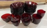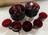 16 Red Bowls, five cups, sugar, creamer, depression glass. Location Left Metal Shelves 16 Red Bowls, five cups, sugar, creamer, depression glass. Location Left Metal Shelves