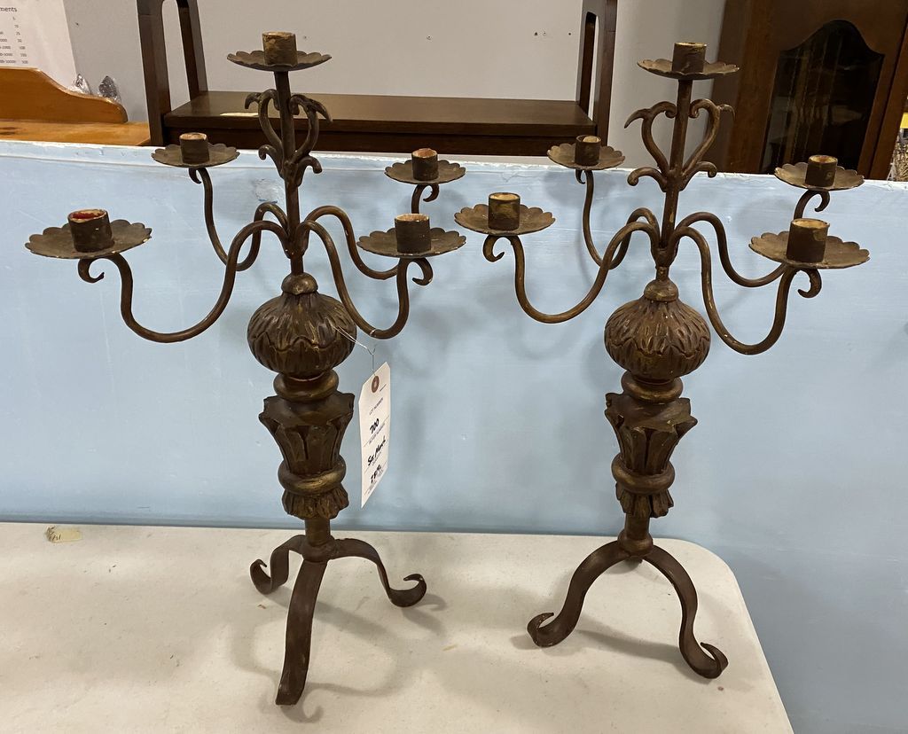 Pair of Antiqued Resin Candelabras, 5 slot candle holders, 25"h. Location Left Metal Shelves Pair of Antiqued Resin Candelabras, 5 slot candle holders, 25"h. Location Left Metal Shelves