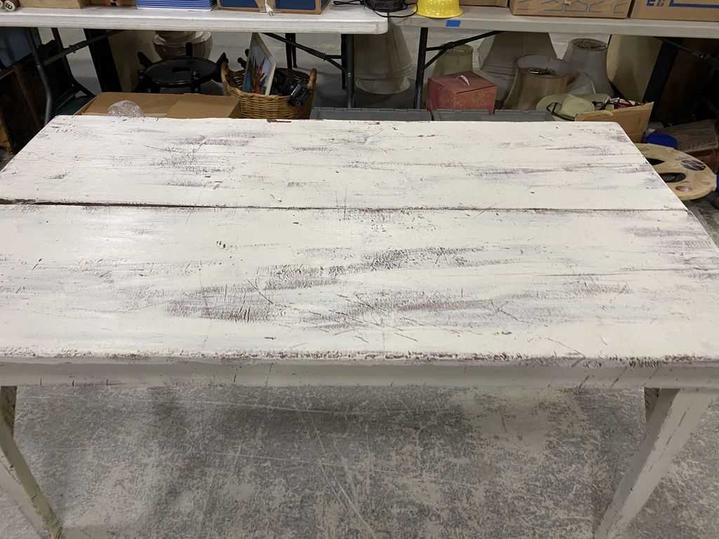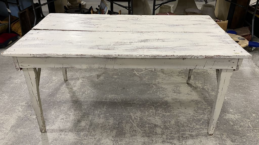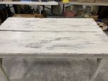 Hand Crafted White Painted Kitchen Table, primitive style, 29"h., 60"w. 34"d. Location Left Office Hand Crafted White Painted Kitchen Table, primitive style, 29"h., 60"w. 34"d. Location Left Office