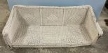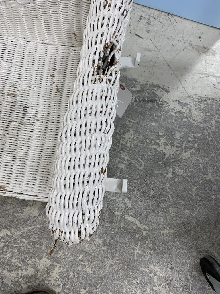 White Wicker Hanging Bench, painted white, has damage spots, 64"w. Location Right Side of Room Wall. Location Right Wall White Wicker Hanging Bench, painted white, has damage spots, 64"w. Location Right Side of Room Wall. Location Right Wall