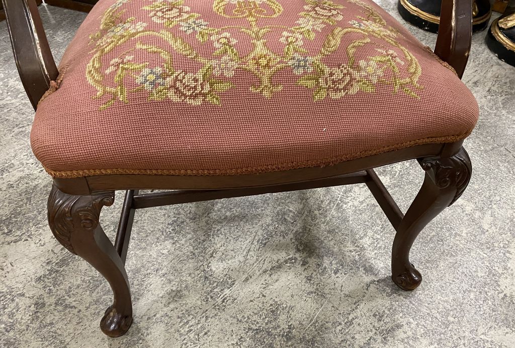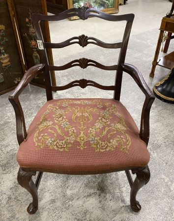 French Style Needlepoint Cushion Arm Chair, mahogany. Location: 1st Row French Style Needlepoint Cushion Arm Chair, mahogany. Location: 1st Row