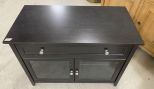 Modern Black TV Stand, drawer, and two door storage, light wear, 30"h., 40"w. ,20"d. Location: 2nd Row Modern Black TV Stand, drawer, and two door storage, light wear, 30"h., 40"w. ,20"d. Location: 2nd Row