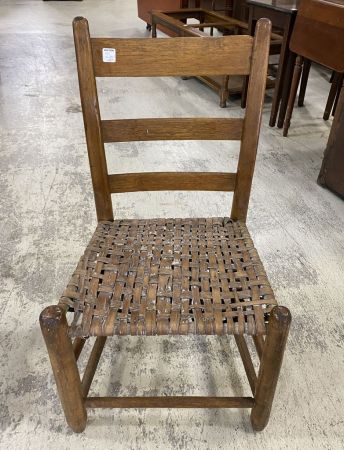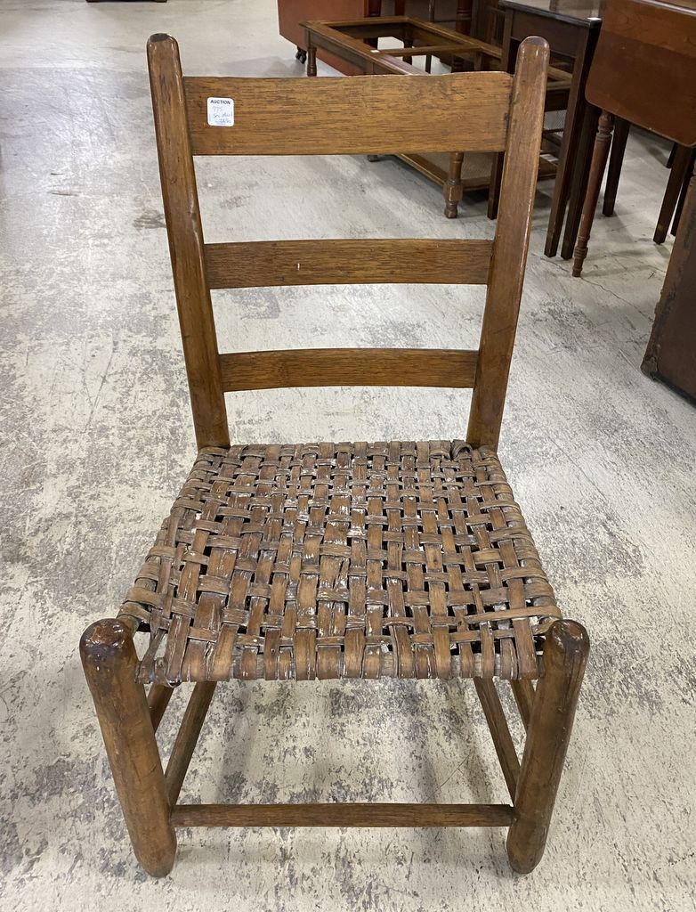 Small Primitive Slat Back Side Chair, woven seat, some light damage, 32"h. Location Left Office Small Primitive Slat Back Side Chair, woven seat, some light damage, 32"h. Location Left Office