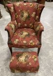 Red Upholstered Arm Chair and Ottoman, mahogany frame, vintage. Location: 1st Row Red Upholstered Arm Chair and Ottoman, mahogany frame, vintage. Location: 1st Row