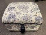 Blue and white upholstered Ottoman, needs cleaning. 19"w. Blue and white upholstered Ottoman, needs cleaning. 19"w.