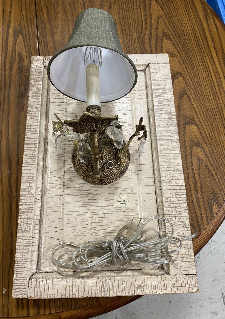 Painted Wood Light Fixture Wall Plaque, 20"h., 13"w. Location Left Metal Shelves Painted Wood Light Fixture Wall Plaque, 20"h., 13"w. Location Left Metal Shelves