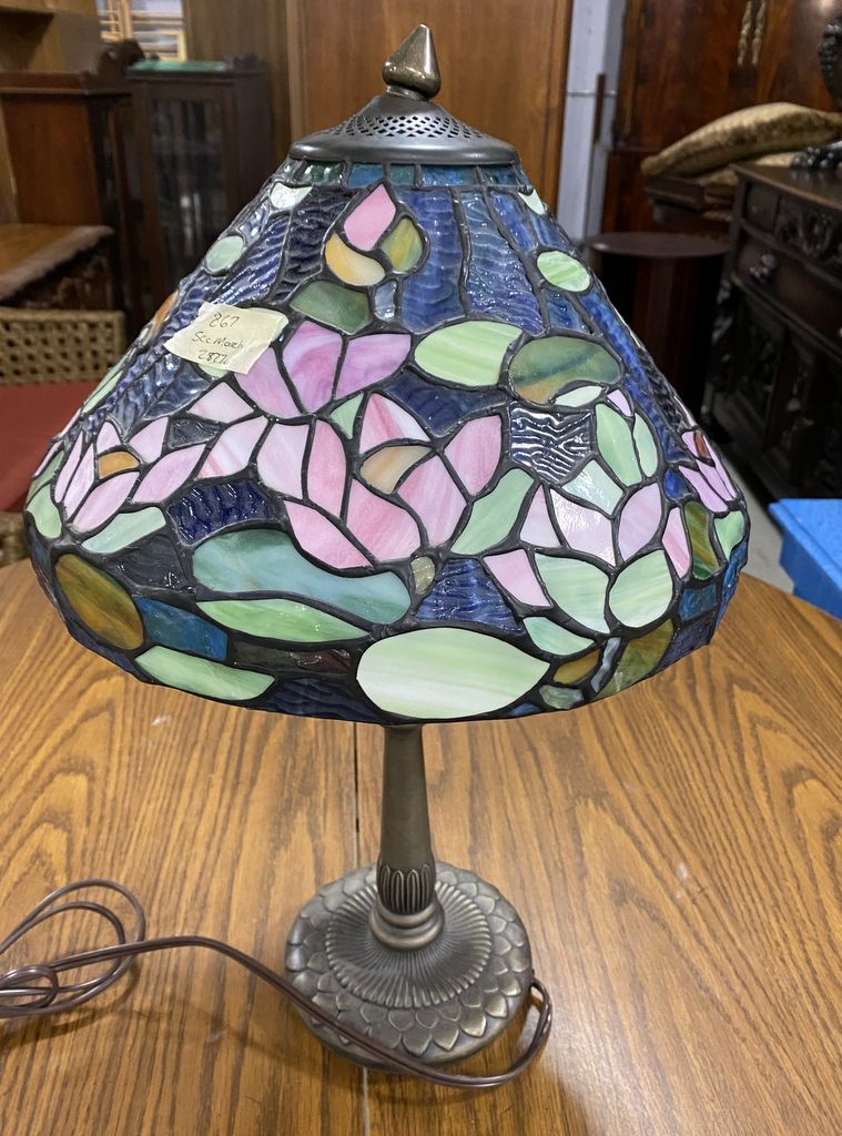 Stained Glass Style Table Lamp, floral, finial needs repair, 20"h. Location Left Metal Shelves Stained Glass Style Table Lamp, floral, finial needs repair, 20"h. Location Left Metal Shelves