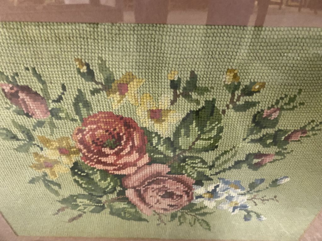 Framed Needle Point Still Life Flowers, matted, framed, 20"h., 24"w. Framed Needle Point Still Life Flowers, matted, framed, 20"h., 24"w.