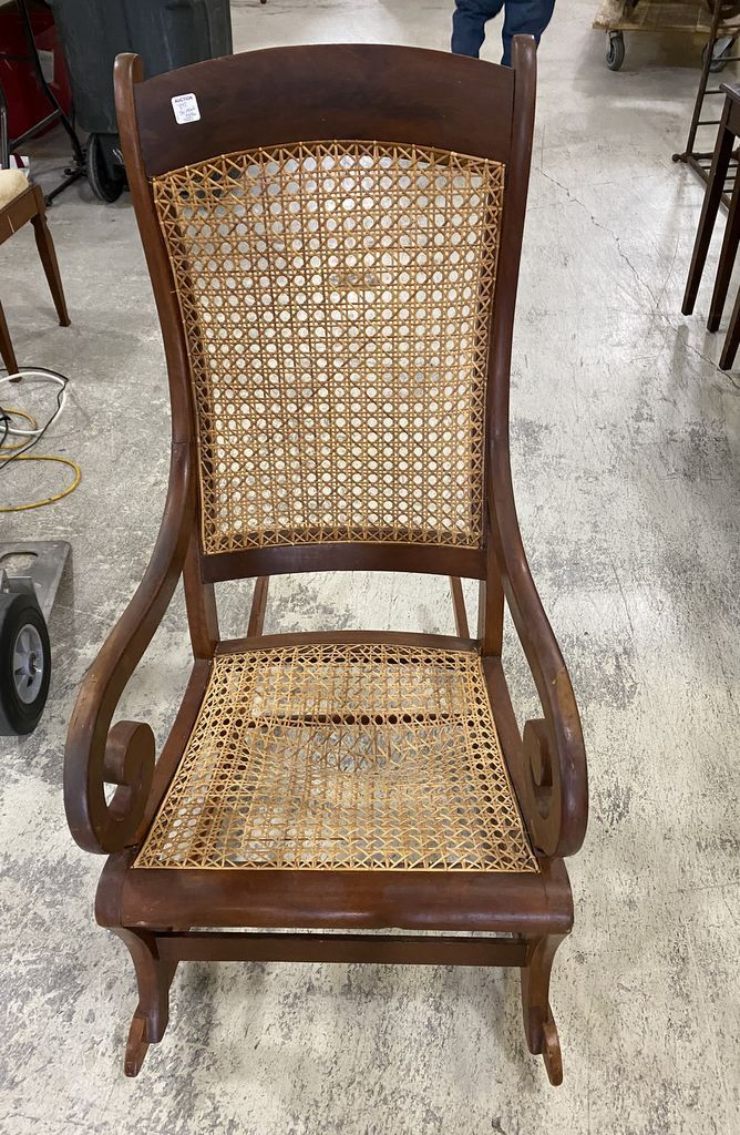 Victorian Style Mahogany Rocker, caned back and seat, seat is damaged. Victorian Style Mahogany Rocker, caned back and seat, seat is damaged.