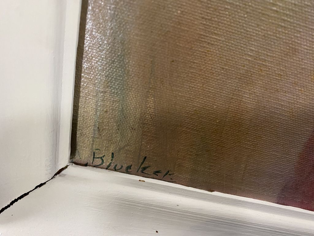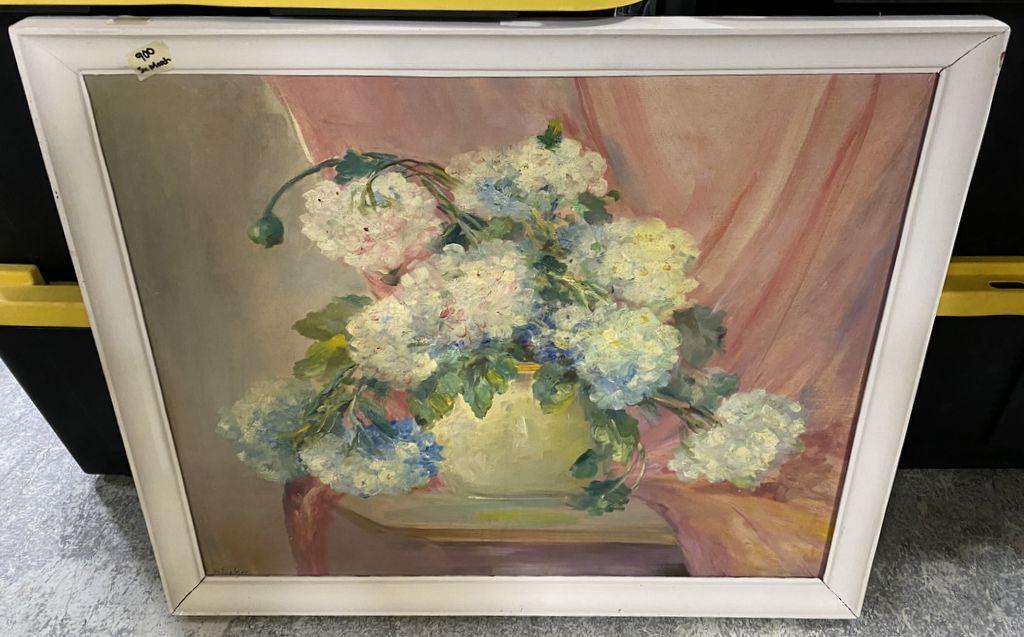 Blucker Still Life Flower Painting, white painted framed, 26"h., 31"w. Blucker Still Life Flower Painting, white painted framed, 26"h., 31"w.