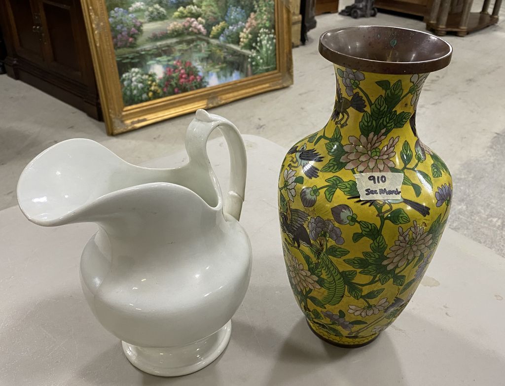 Asian Style Vase with dent 13"h. and Porcelain Ironstone Pitcher, Location Left Metal Shelves Asian Style Vase with dent 13"h. and Porcelain Ironstone Pitcher, Location Left Metal Shelves