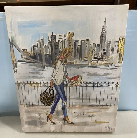 Painting of City Walk by Long, unframed canvas, 21"h., 16"w. Location: Back Wall Painting of City Walk by Long, unframed canvas, 21"h., 16"w. Location: Back Wall