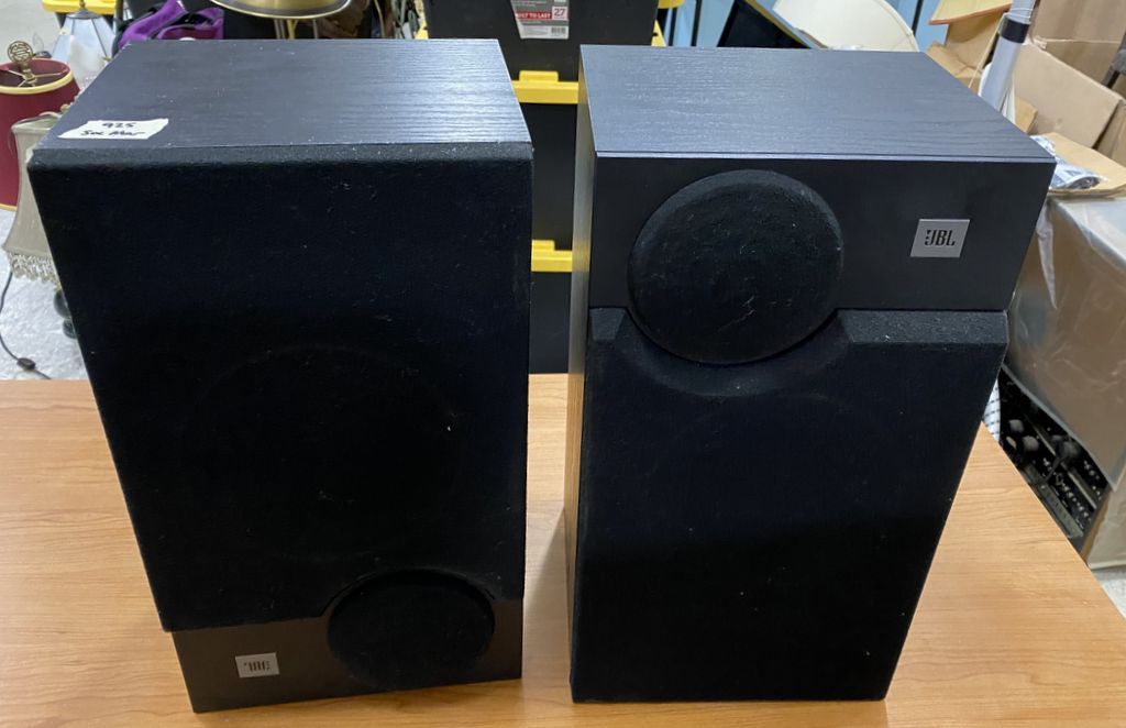 Two JBL Surround Sound Speakers, untested. Location Right Metal Shelves Two JBL Surround Sound Speakers, untested. Location Right Metal Shelves