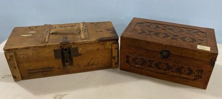 Two Wood Storage Boxes, one small wood crate, and one decorative box. Location Left Metal Shelves Two Wood Storage Boxes, one small wood crate, and one decorative box. Location Left Metal Shelves